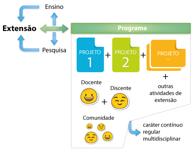 Programa: um conjunto integrado de pelo menos dois projetos e outras atividades de extensão, de caráter contínuo, regular, multidisciplinar e indissociável à pesquisa e ao ensino, com a participação de discentes, servidores e comunidade externa, alinhado ao Planejamento Estratégico do IFSC.