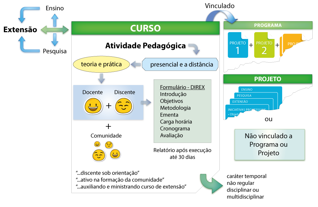 Curso: atividade pedagógica de caráter teórico e prático, de oferta não periódica, presencial ou a distância, com objetivos, carga horária, ementa, cronograma e critérios de avaliação definidos em formulário próprio disponibilizado pela Diretoria de Extensão. Deve ser indissociável da pesquisa e do ensino, com a atuação de discentes e servidores e a participação da comunidade externa, alinhado ao Planejamento Estratégico do IFSC. Alunos do IFSC atuam ativamente nos cursos de extensão, inclusive ministrando-os, sob orientação docente.
