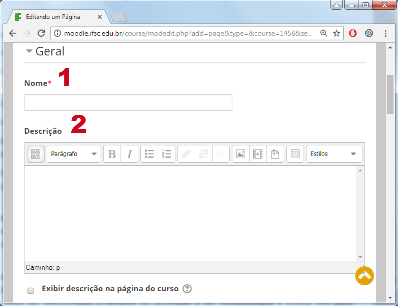 Disponibilizada também por meio de um link na área de trabalho, nesta opção, existe a possibilidade de formatação, de inserir links para outras páginas e imagens, podendo ser configurado de acordo com os objetivos do professor. Escolha um tópico do seu curso/disciplina, na área de trabalho, no qual você deseja acrescentar o recurso "Página". Ao selecionar este recurso, a página a seguir apresenta, parcialmente, as possibilidades de configuração, conforme segue.