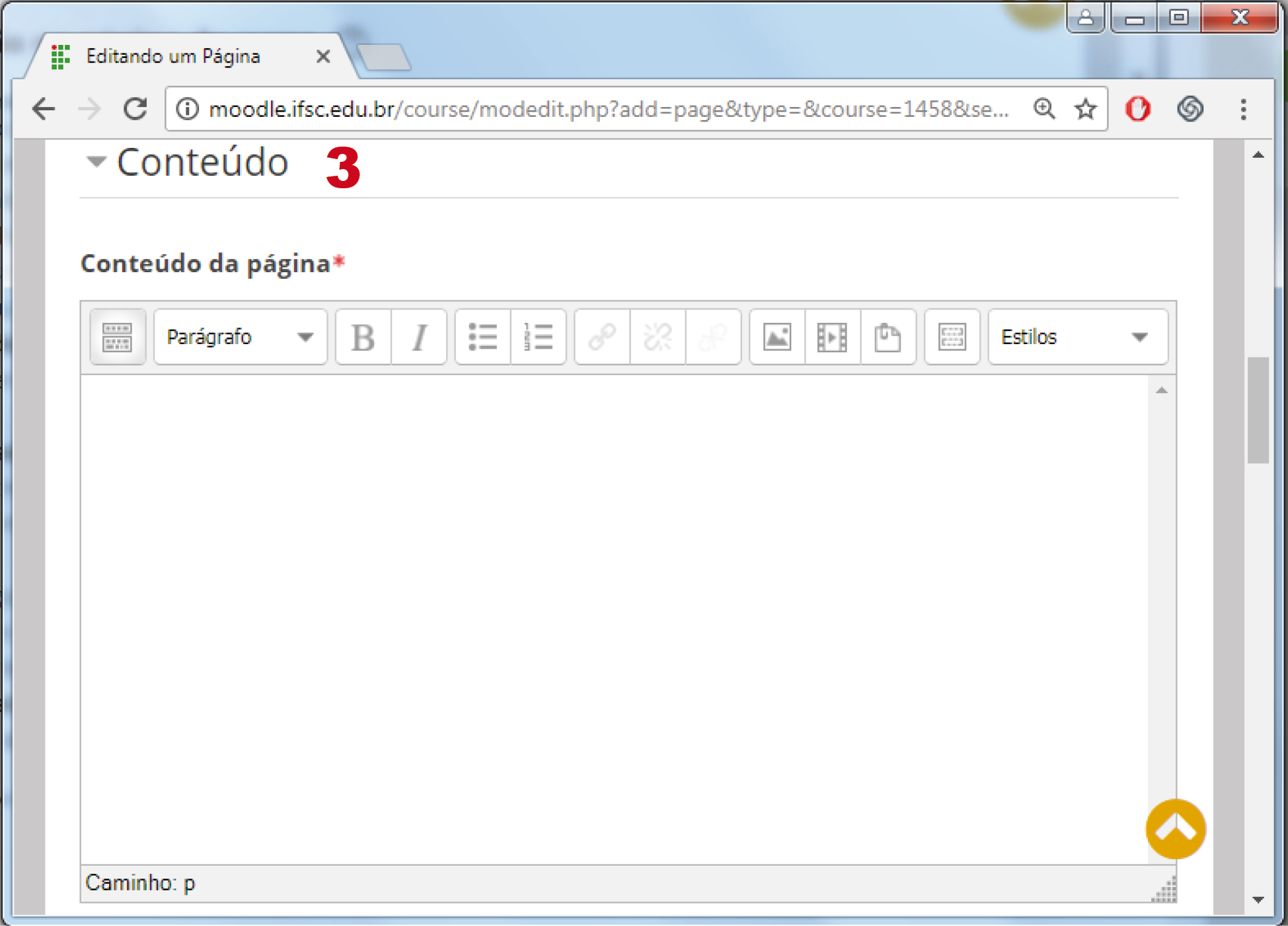 3. Conteúdo da página: neste campo, você insere o texto a ser disponibilizado. Como se observa na Figura 169, esse campo permite a possibilidade de formatação. Seguindo a mesma página de configuração.