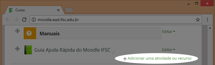 Siga para o tópico desejado e clique em "adicionar atividade ou recurso".