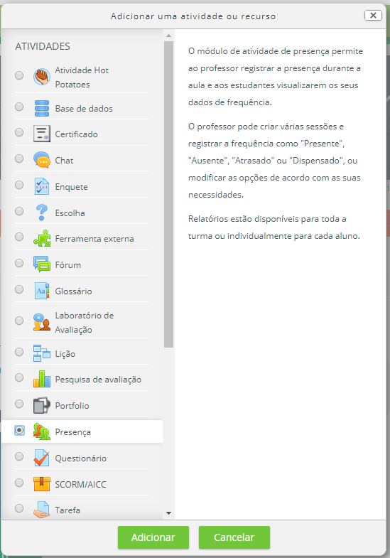 O módulo de atividade de presença permite ao professor registrar a presença durante a aula e aos estudantes visualizarem os seus dados de frequência.